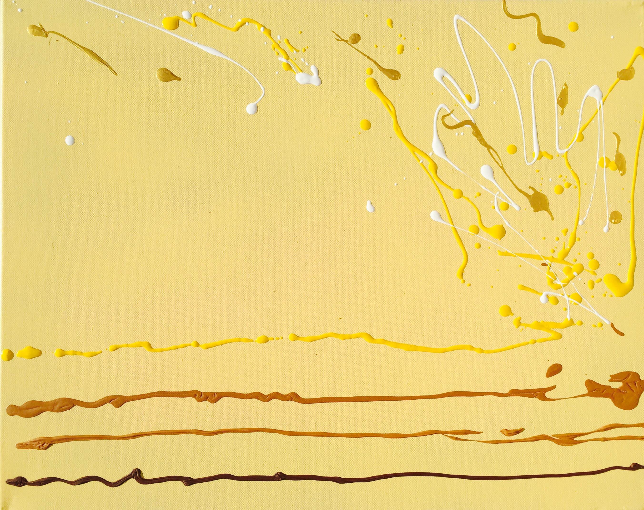 This work is 16″ x 20″ and made with acrylic and latex. I wanted to experiment with yellow and shades of brown. The name represents the sound and not soda or someone’s dad. I put three lines at the bottom of the work running, theoretically, from left to the right, where the top line explodes. The “explosion, stretches back to the left to attract the viewer’s eye to the top left corner, in order to keep the eye moving around the canvas. “Pop” was the first painting I made for this show.