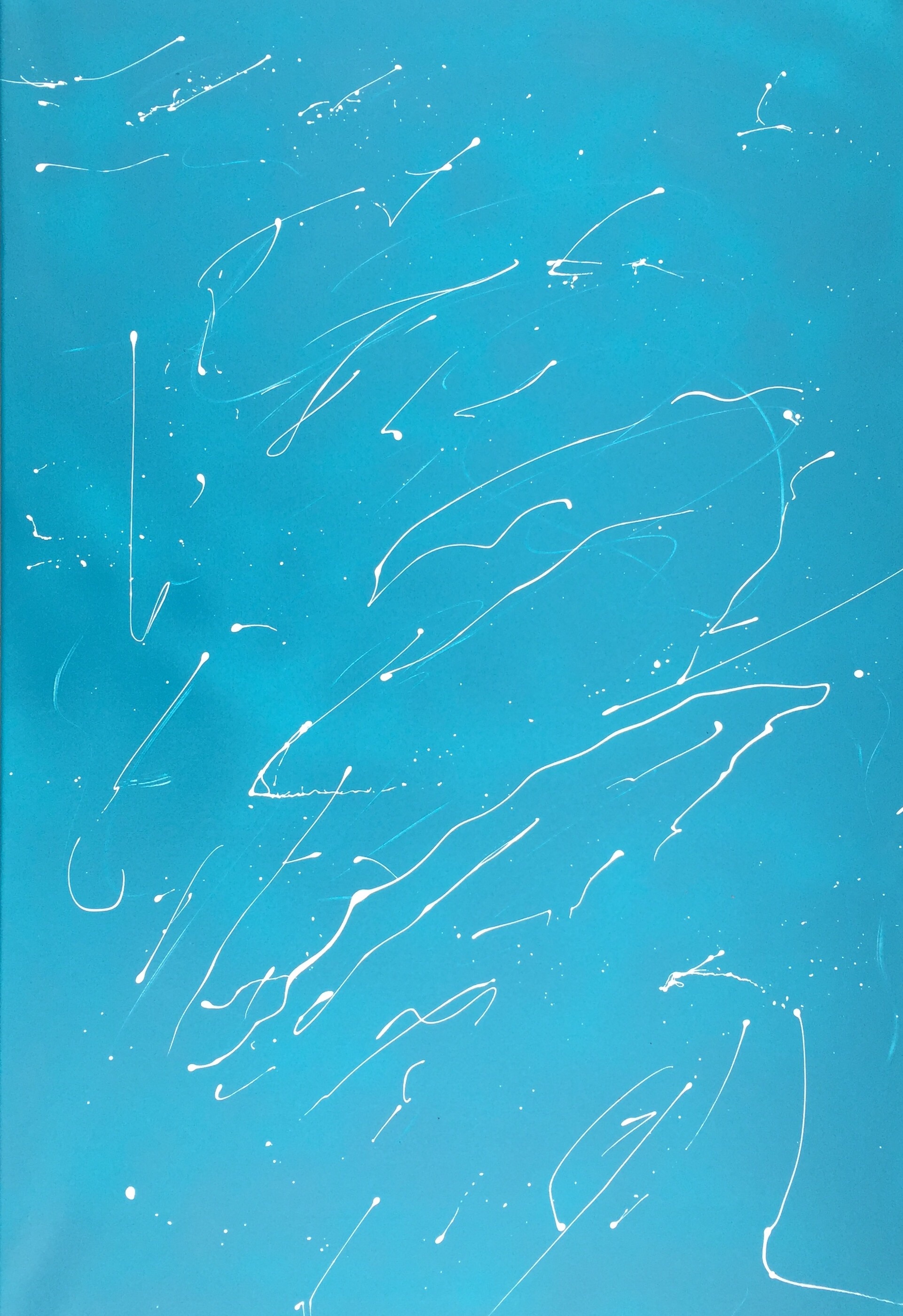 Once I had sprayed the background and while it was still wet, I decided to tinker with a subtractive process and scratched some random lines into the paint with a stick (I have been painting in my front yard of late–weather permitting) revealing the white canvas beneath. Then I carefully dipped a brush in white latex to maintain control over the paint and dribbled white lines approximately parallel to the scratches. The result gave the feeling of distance between the white paint and the faded white near it. This looks like a light snow falling from a clear, blue sky and thus the name.