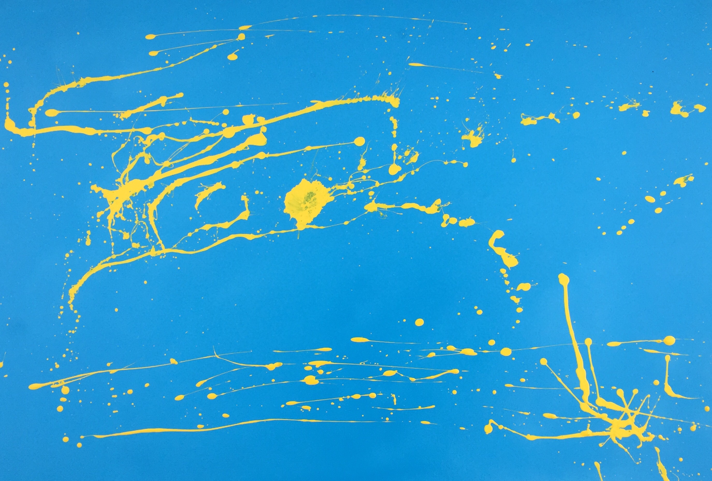 I created this on May 22-23, 2015 using Rustoleum’s Oasis Blue (satin finish) for the background and yellow latex that I had mixed at a local paint store. The canvas is 24″ x 36″. After I had sprayed the background, I felt I wanted to use just one color for the splatter (action might be a better word). I had used white already for A Winter’s Day and thought this tone of yellow would be a nice touch. I wanted to produce a bright but simple work that would grab the attention from across a gallery filled with competitors’ works. Part of my merchandising strategy is to produce works that are simple in concept and execution so that they stand out and are easily comprehensible from across a crowded gallery lined with other artists’ works of many colors, but which blend together in the eye from a distance, producing a muddled result. This optical strategy I derived from the little reading I have done on Georges Seurat and pointillism.