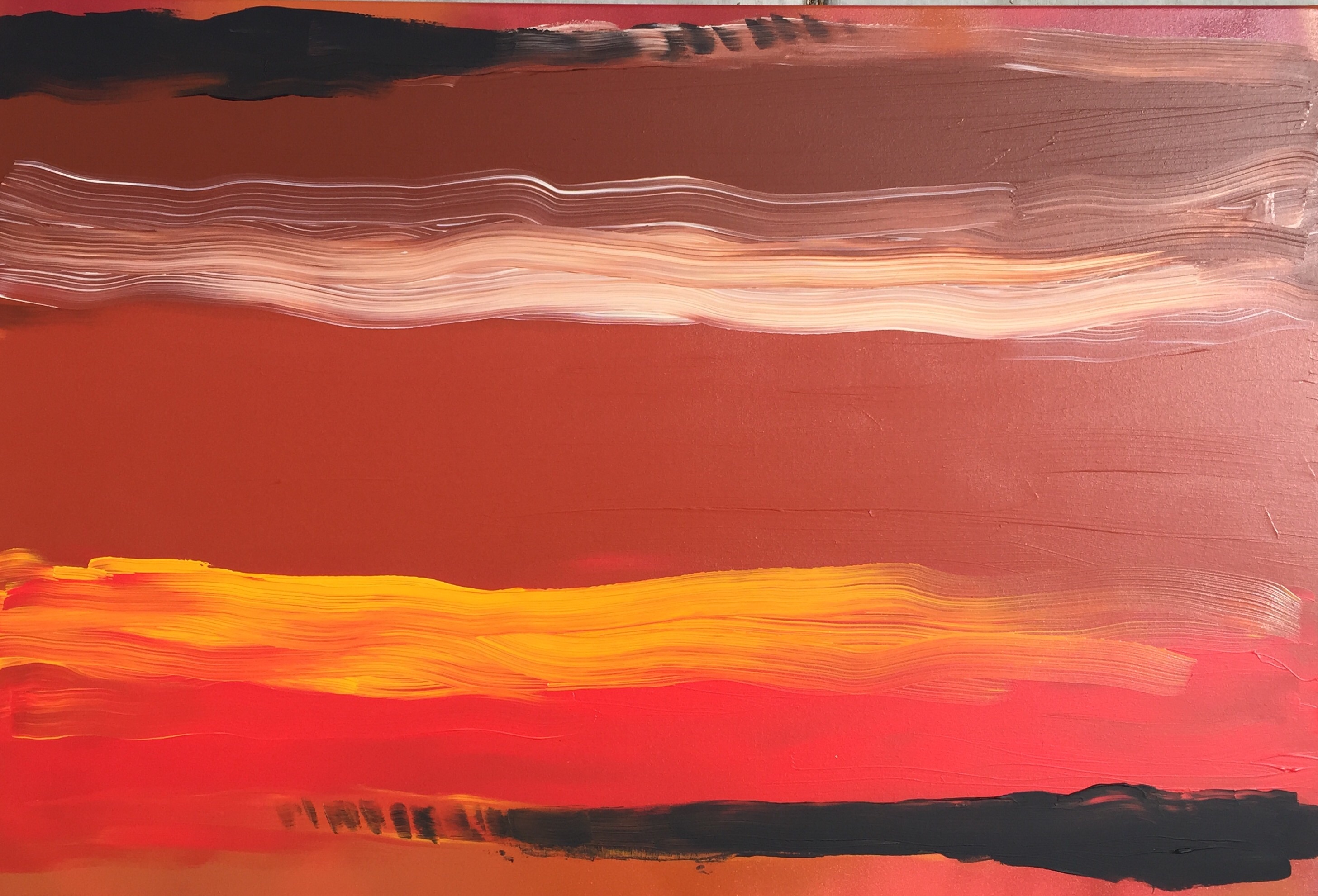 24″ x 36″. I was experimenting with creating a peaceful feeling using horizontal lines and using a brush instead of my usual splattering. I named it after my first impression, which was that it reminded me of the sun setting over the reservation to the west of Farmington.