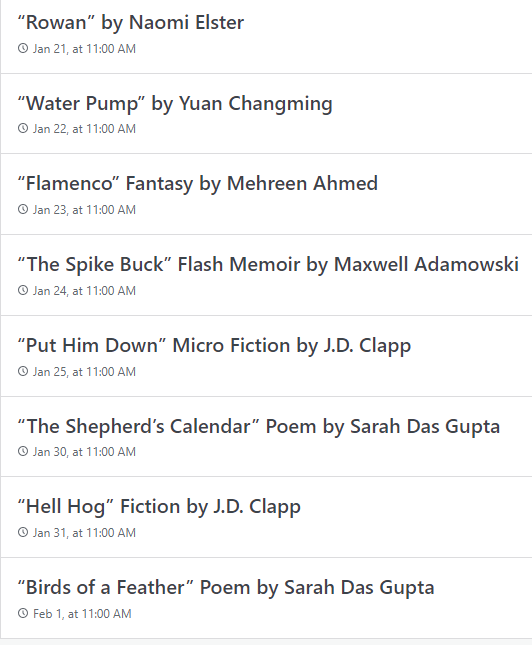 So far at least six stories and two poems, each appearing on separate days, have been scheduled for publication between now and February 1. If more are scheduled, their titles and authors will be posted on this blog. Here are the ones currently slated: