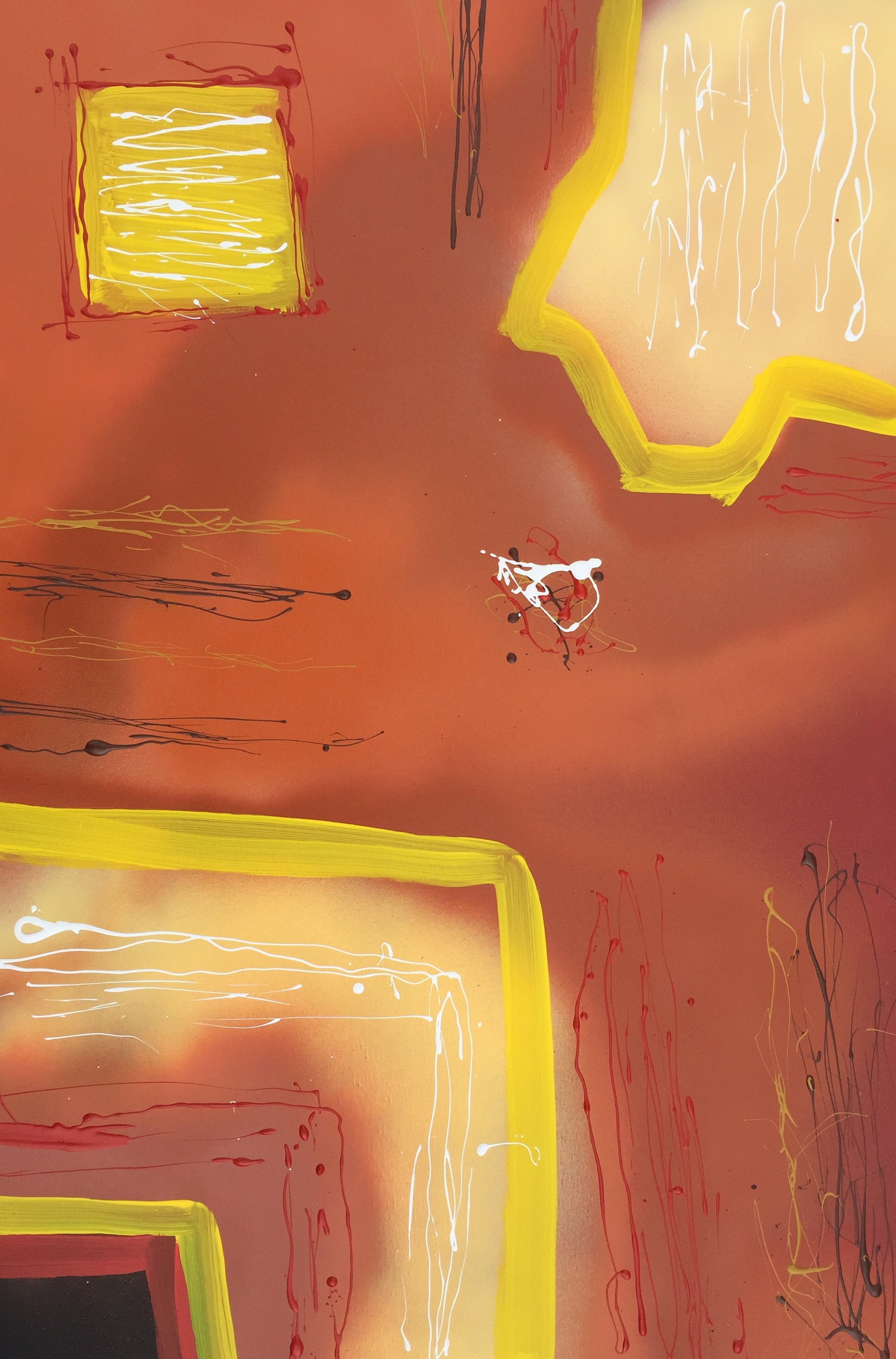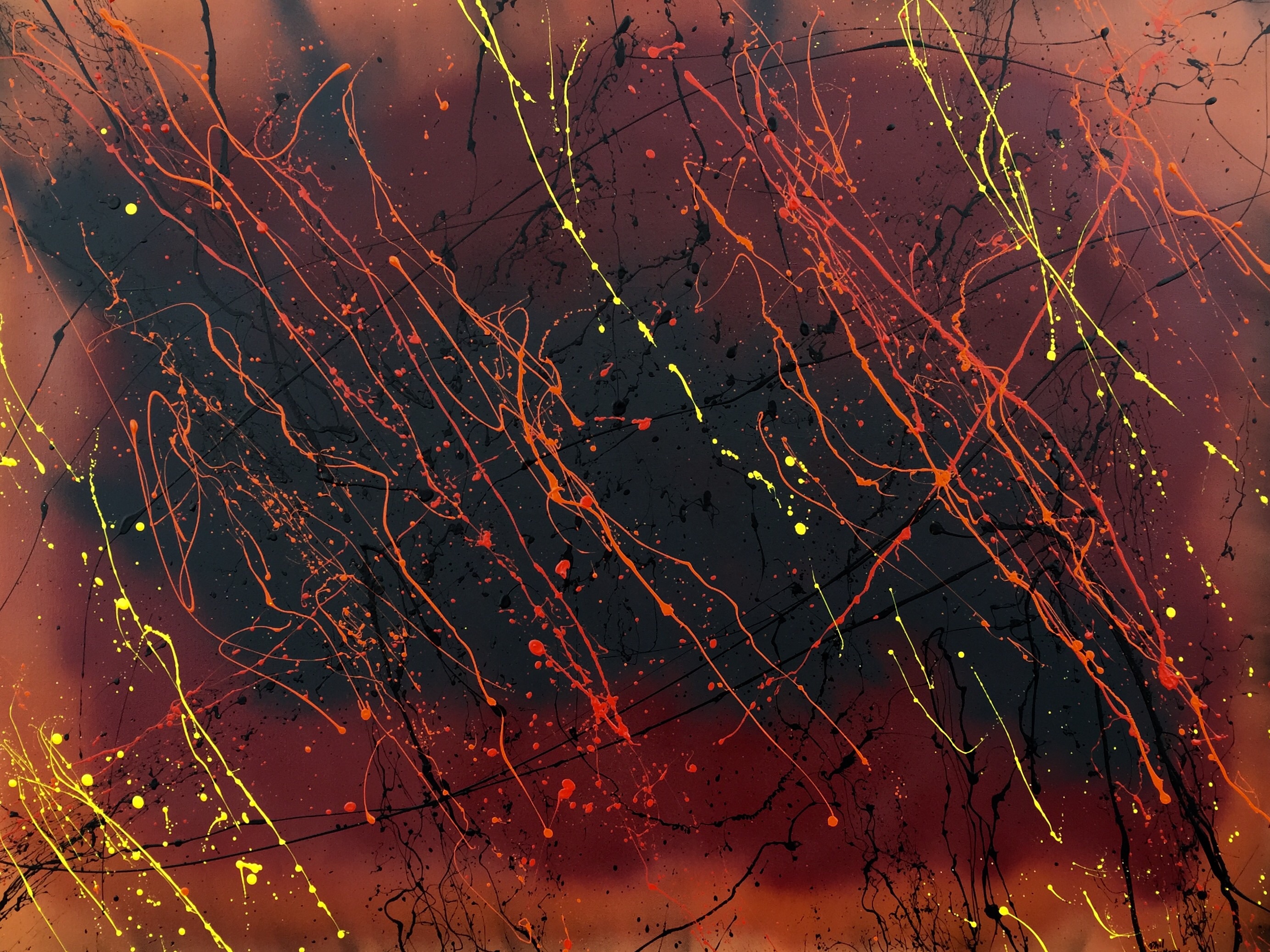 I was caught up by the same spirit when I was creating “De Profundis” and “Descent”. As with them, I wanted something to capture a bit of the spirit of my upcoming (maybe in a few years) horror novel concerning hell. I did not want to go to town to buy another canvas, therefore I re-used one on which I had a draft of another work, which was progressing more slowly than anticipated (I was using a brush rather than my usual abstract technique). I used almost all my leftover spray paint in this. As I progressed, I decided to apply the red, orange, and yellow so as to simulate depth by laying down the dark red in a few lines first, then the medium orange on either side of the red streaks, and then applying the yellow judiciously between the orange streaks. The intent is that the dark red will tend to be seen by most people as farther in the distance, the orange closer, and the yellow closest of all. The nebulous background created by the spray paint will likewise appear farther in the distance than the sharp, erratic lines created by stringing paint onto the canvas. I have some to love this strategy of creating a nebulous background and then slinging house paint onto the canvas, which creates solid, sharp lines providing visual (and psychological?) contrast.