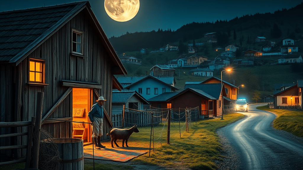 The brightly colored homes, the royal blues and turquoises, the sandy oranges and vermilions, which dotted the village in random patterns here, orderly lines there, the little houses which were invariably described as “storybook” by the tourists, the Germans and Americans and Ukrainians, all of these were gone at night. Instead, a dozen tiny windows shone dim yellow from reading lamps or dimmer blue from televisions. Headlights crawled down and up the dirt road from time to time, a faint gravelly song ascending from beneath the tires and up the hillside to where the goatherd stood outside his barn. A street lamp hung outside the little roadside clinic where the doctor and his daughter stood watch, day and night, to aid villagers or travelers in pain.